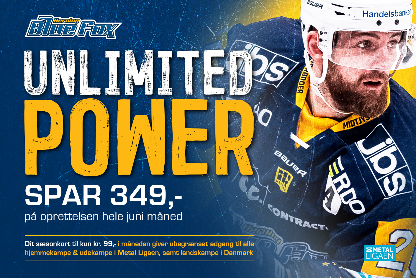 Unlimited Hockey har set dagens lys i den bedste danske ishockeyrække. Her får du for herningensernes vedkommende adgang til alle Blue Fox’ hjemmekampe på Kvik Hockey Arena, Metal Liga udekampe i grundspillet samt Danmarks landskampe på dansk is i sæsonen 2020-21. Ganske enkelt et stort ubegrænset ishockey-overflødighedshorn, hvor der venter massevis af fede timer på lægterne til en fast månedlig pris på kun 99 kroner, uanset om man vil have sidde- eller ståplads.